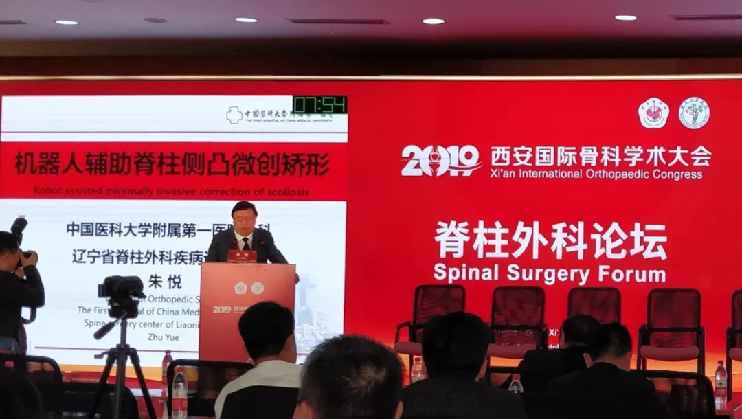 在脊柱外科論壇中,中國醫科大學附屬第一醫院朱悅教授做了題為《機器人輔助脊柱側凸微創矯形》的主題發言。他指出,目前骨科手術機器人已應用到關節外科、運動醫學、創傷領域及脊柱外科等學科中,他以中國醫大一院完成的國內首例天璣?骨科手術機器人聯合可彎曲錐體后凸成型系統治療骨質疏松性椎體壓縮骨折的手術為例,高度肯定了天璣? 在骨科手術中的作用。天璣? 作為國際上唯一能夠開展脊柱全節段(頸椎、胸椎、腰椎、骶椎)的骨科手術機器人系統,在手術過程中充當著骨科手術醫生的“第三只手”,充分發揮了智能、精準、微創的優勢,結合可彎曲椎體后凸成型系統,給術者的操作帶來更大的方便,提高了手術效率,也給患者帶來了更加的術后效果。